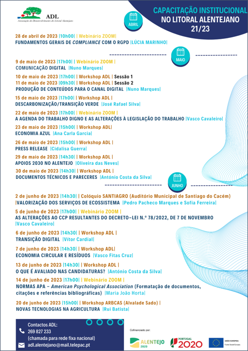 A ADL, no âmbito do projeto “Capacitação Institucional do Litoral Alentejano 21/23”, financiado pelo PO Alentejo 2020, encontra-se a realizar, nos meses de maio e junho, um ciclo de Workshops presenciais e Webinários alusivos a várias temáticas com vista à capacitação das organizações.