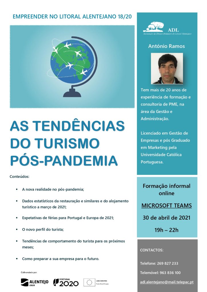 No âmbito do projeto Empreender no Litoral Alentejano 18/20, integrando um plano de ações de sensibilização e capacitação de promotores de empresas, a ADL irá realizar uma sessão de formação informal, em formato online, com o tema “As tendências do Turismo Pós-Pandemia”, no próximo dia 30 de abril de 2021, pelas 19h00, através do Microsoft Teams.