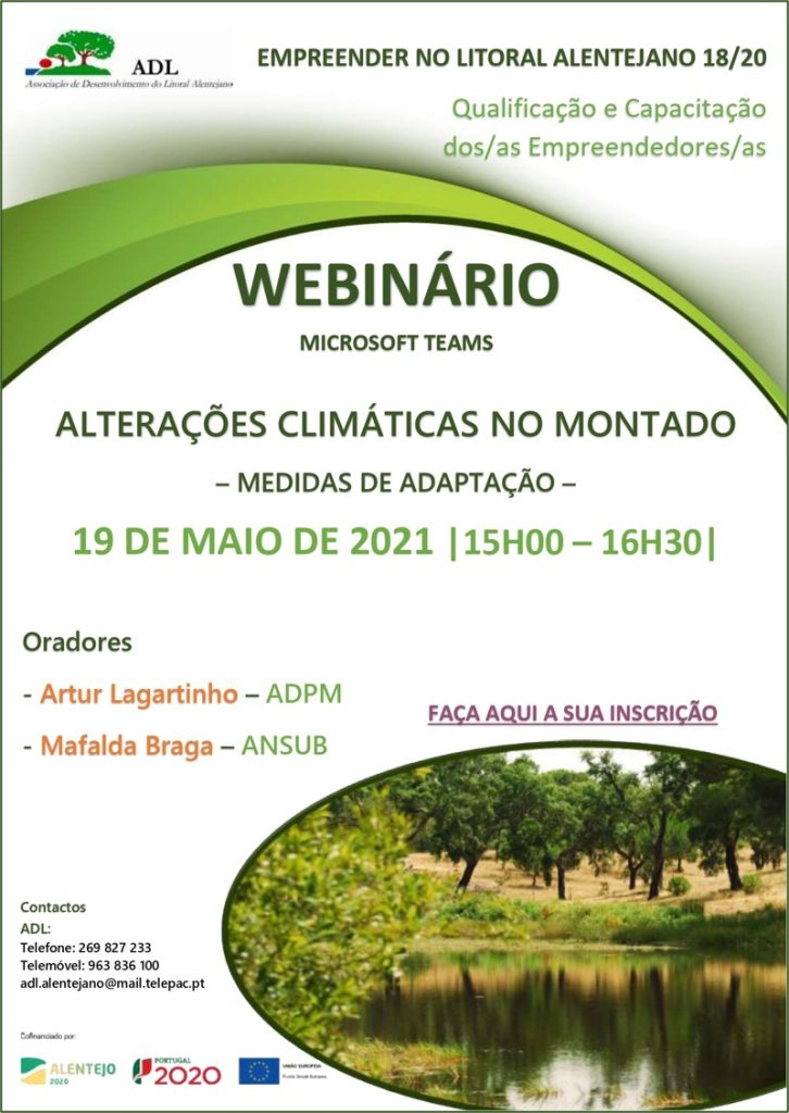 No âmbito do projeto Empreender no Litoral Alentejano 18/20, a ADL irá realizar o Webinário “Alterações Climáticas no Montado – Medidas de Adaptação”, com os consultores Artur Lagartinho (ADPM) e Mafalda Braga (ANSUB), no próximo dia 19 de maio de 2021, pelas 15h00, através do Microsoft Teams.