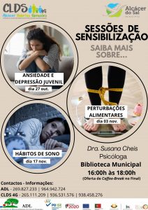 Nos próximos dias 27 de outubro, 03 e 17 de novembro a ADL irá realizar, em parceria com a Psicóloga Dra. Susana Cheis, três sessões de sensibilização sobre as temáticas da “Ansiedade e Depressão Juvenil”, das “Perturbações Alimentares” e dos ”Hábitos de Sono”, respetivamente.