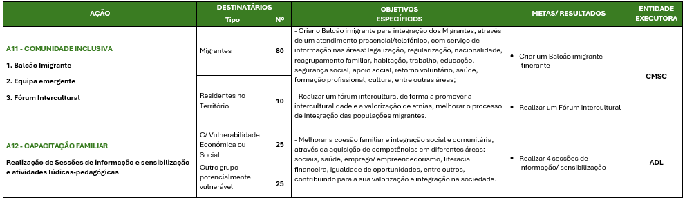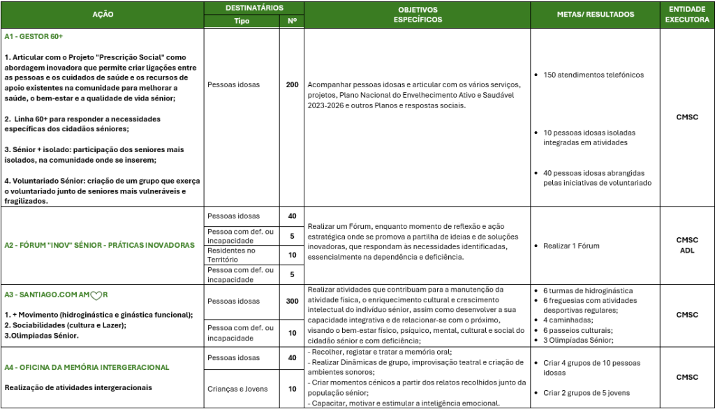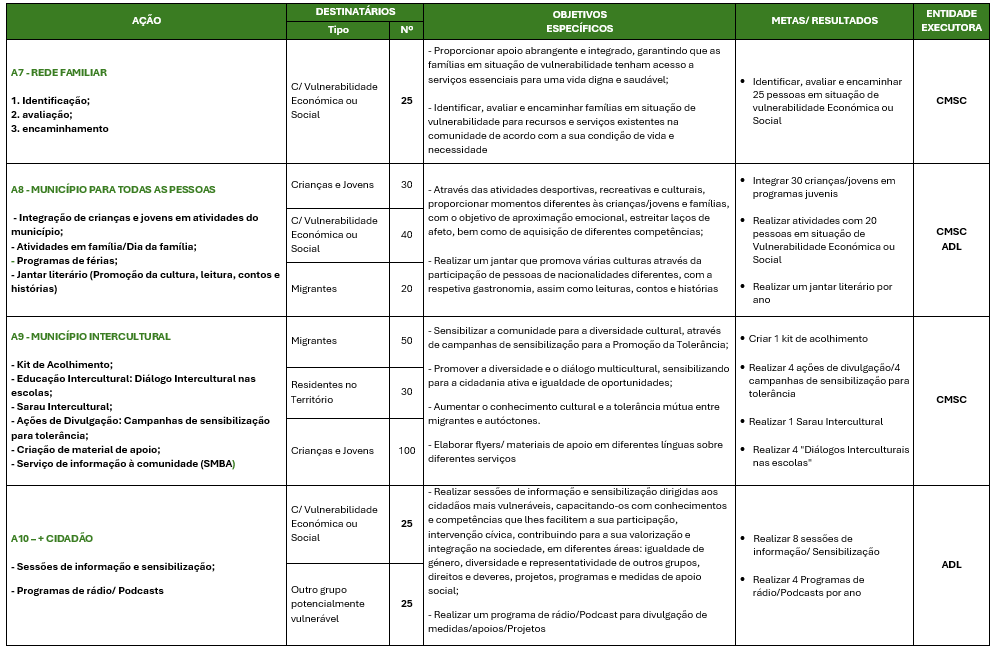 Promover a inclusão social de grupos populacionais que revelem maiores níveis de vulnerabilidade social (pessoas idosas, pessoas com vulnerabilidade económica ou social, outros grupos potencialmente vulneráveis, famílias, crianças, jovens, migrantes, minorias étnicas e pessoas com deficiência ou incapacidade) residentes no concelho de Santiago do Cacém, promovendo a mudança tendo em conta os fatores de vulnerabilidade, quebrando ciclos intergeracionais de pobreza e de exclusão social e garantindo a coesão social e territorial.