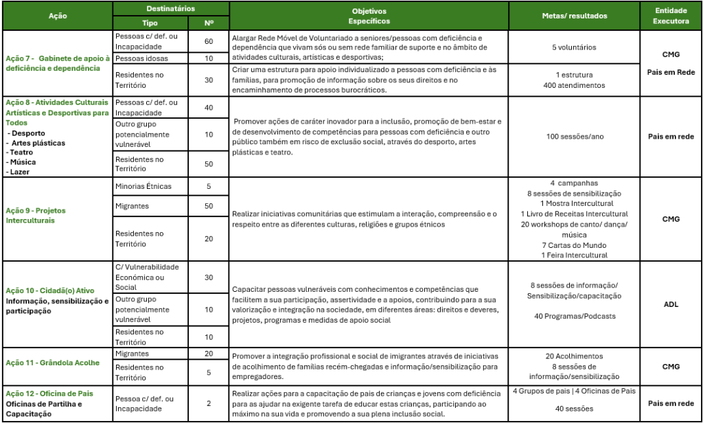 Promover a inclusão social de grupos populacionais que revelem maiores níveis de vulnerabilidade social (famílias, crianças, jovens, com vulnerabilidade económica ou social, outros grupos potencialmente vulneráveis, imigrantes, minorias étnicas e pessoas com deficiência ou incapacidade) residentes no concelho de Grândola, promovendo a mudança tendo em conta os fatores de vulnerabilidade, quebrando ciclos intergeracionais de pobreza e de exclusão social e garantindo a coesão social e territorial.